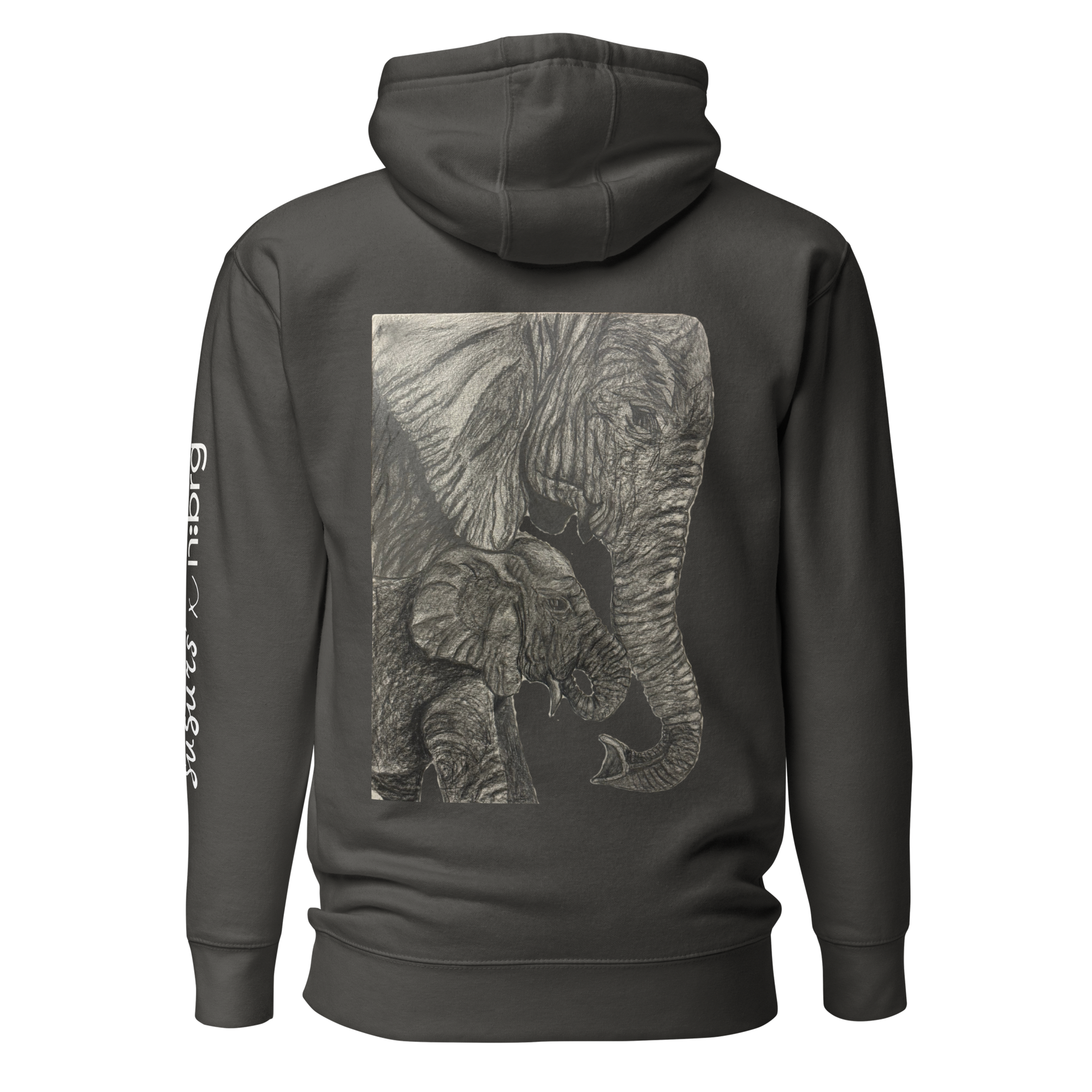 A couple holding their hands and looking at each other with love while wearing 2 beuatiifuly designed niiberg hoodies with elephants sketches on their backs of the hoodie.